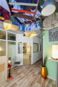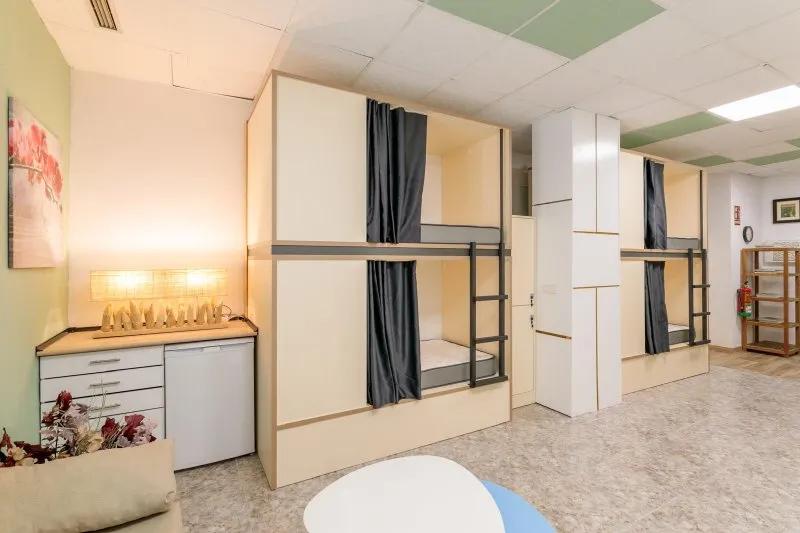 Hemos diseñado un sistema de descanso que rompe con la imagen tradicional del hostal. Estas estructuras box se integran perfectamente en cualquier espacio, utilizando paneles de color claro que reflejan la luz natural y artificial, haciendo que la habitación se sienta más grande y acogedora.