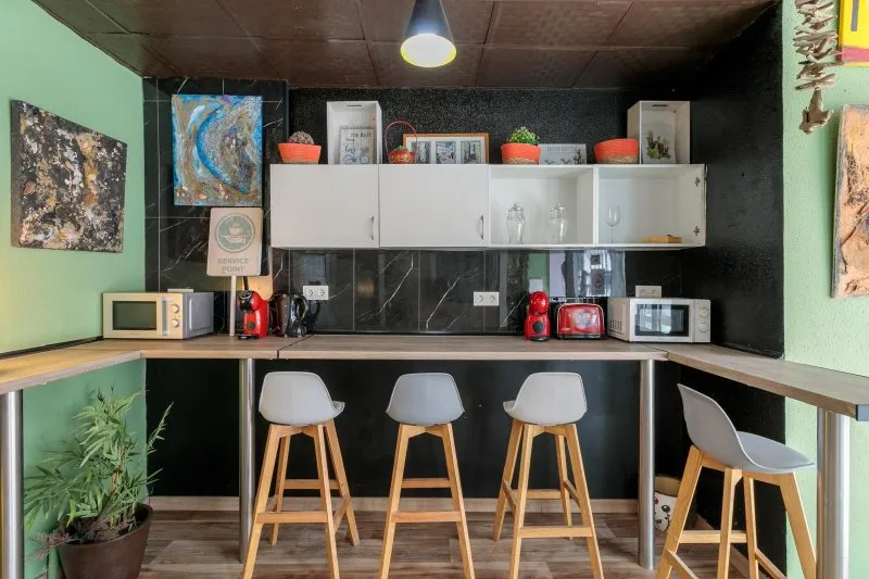 Nuestra experiencia en el sector contract va más allá de las literas. Entendemos que el éxito de un hostel reside en sus áreas comunes. Presentamos diseños de cocina-bar a medida que fusionan estilo urbano, funcionalidad y durabilidad.